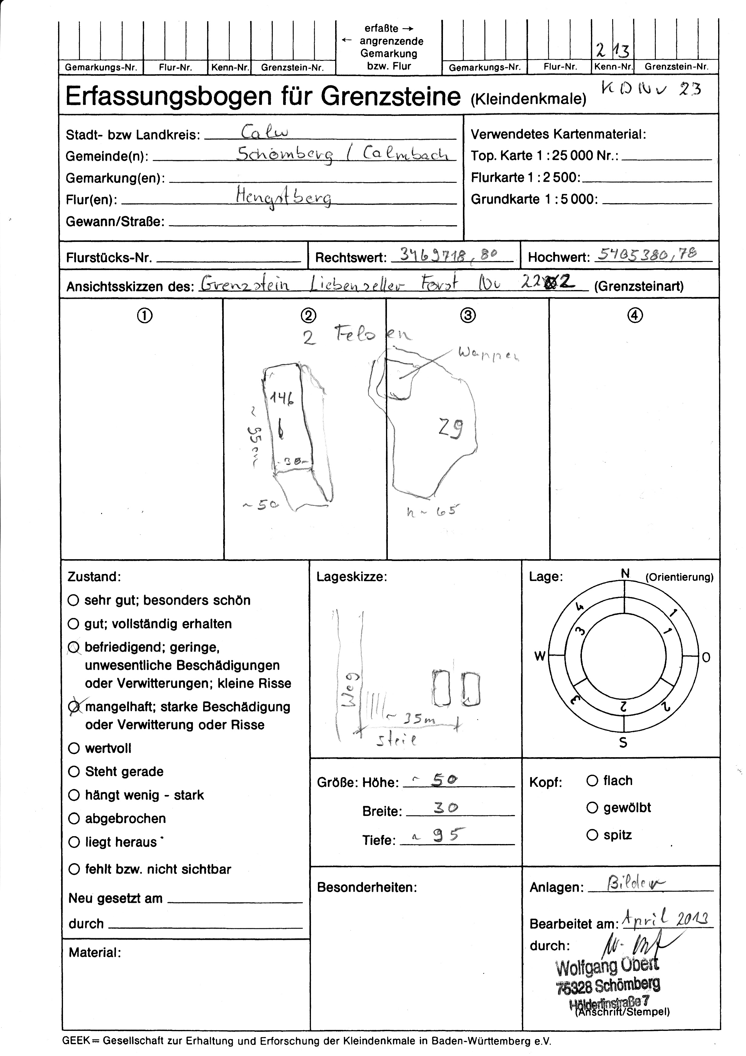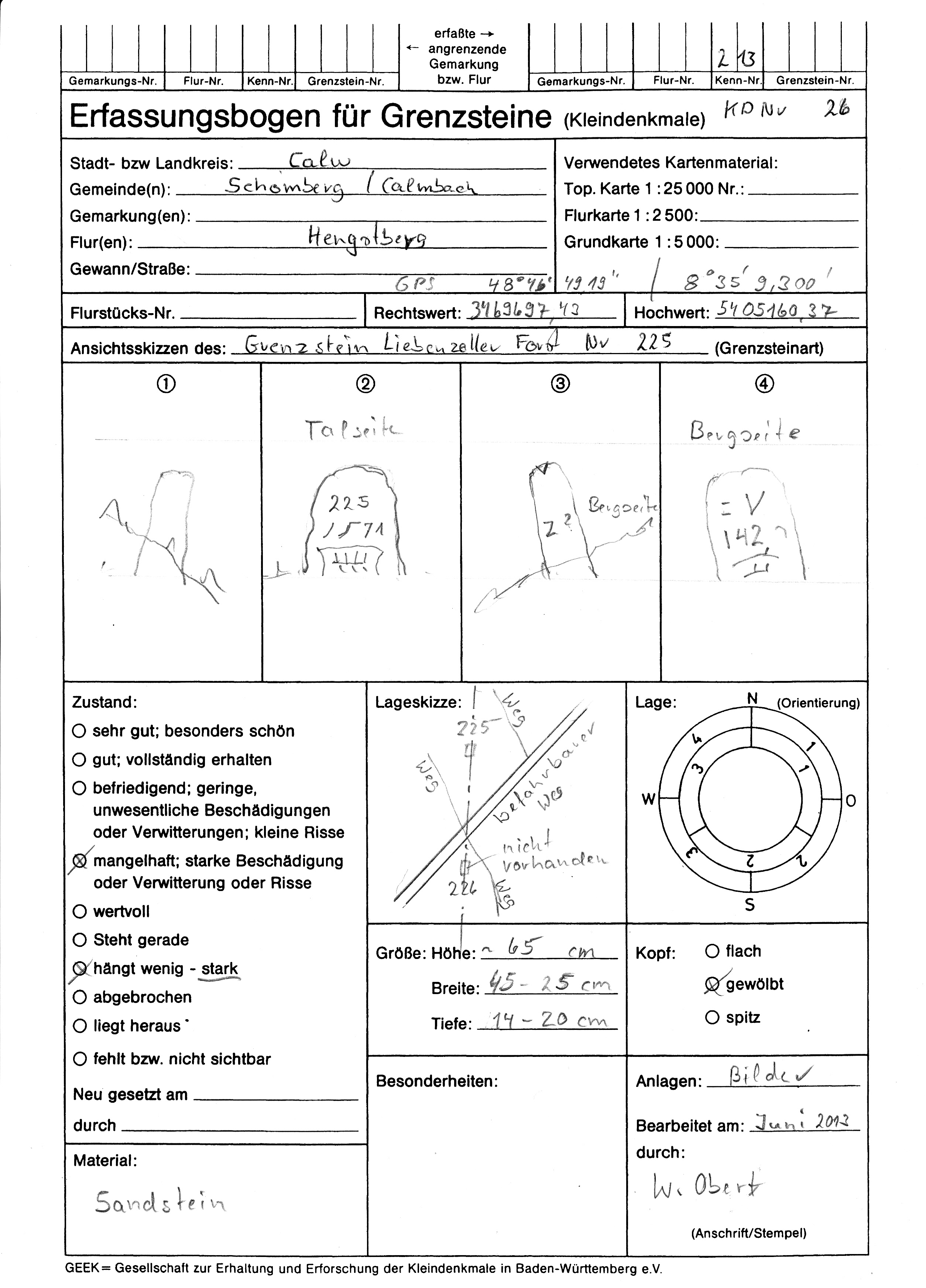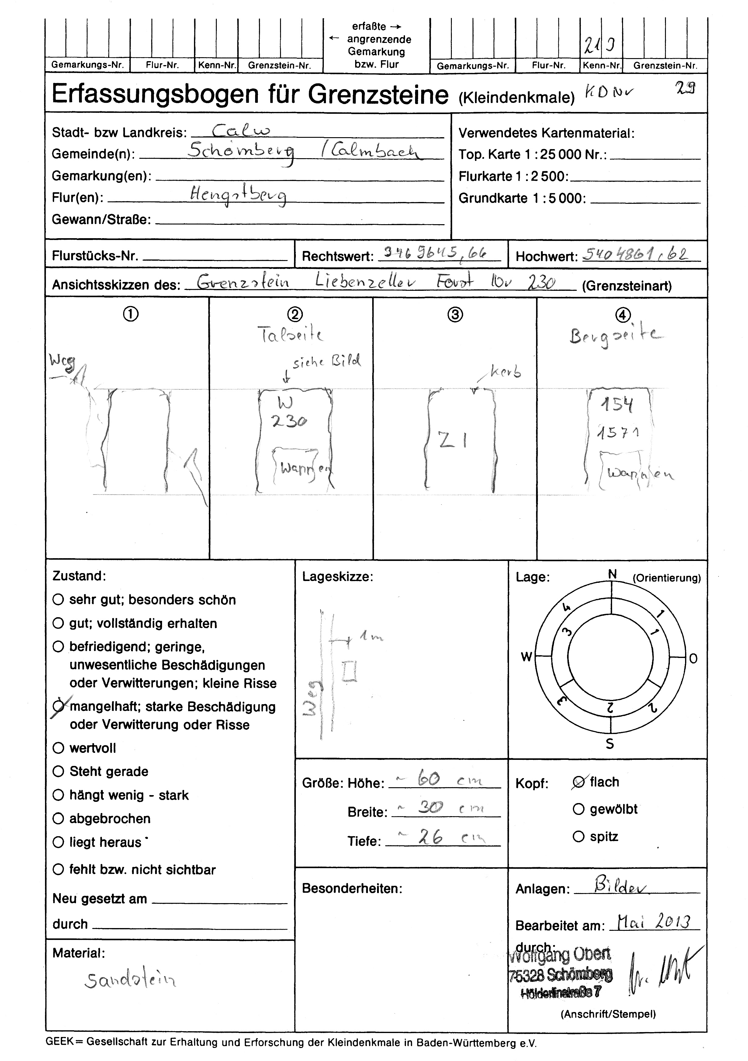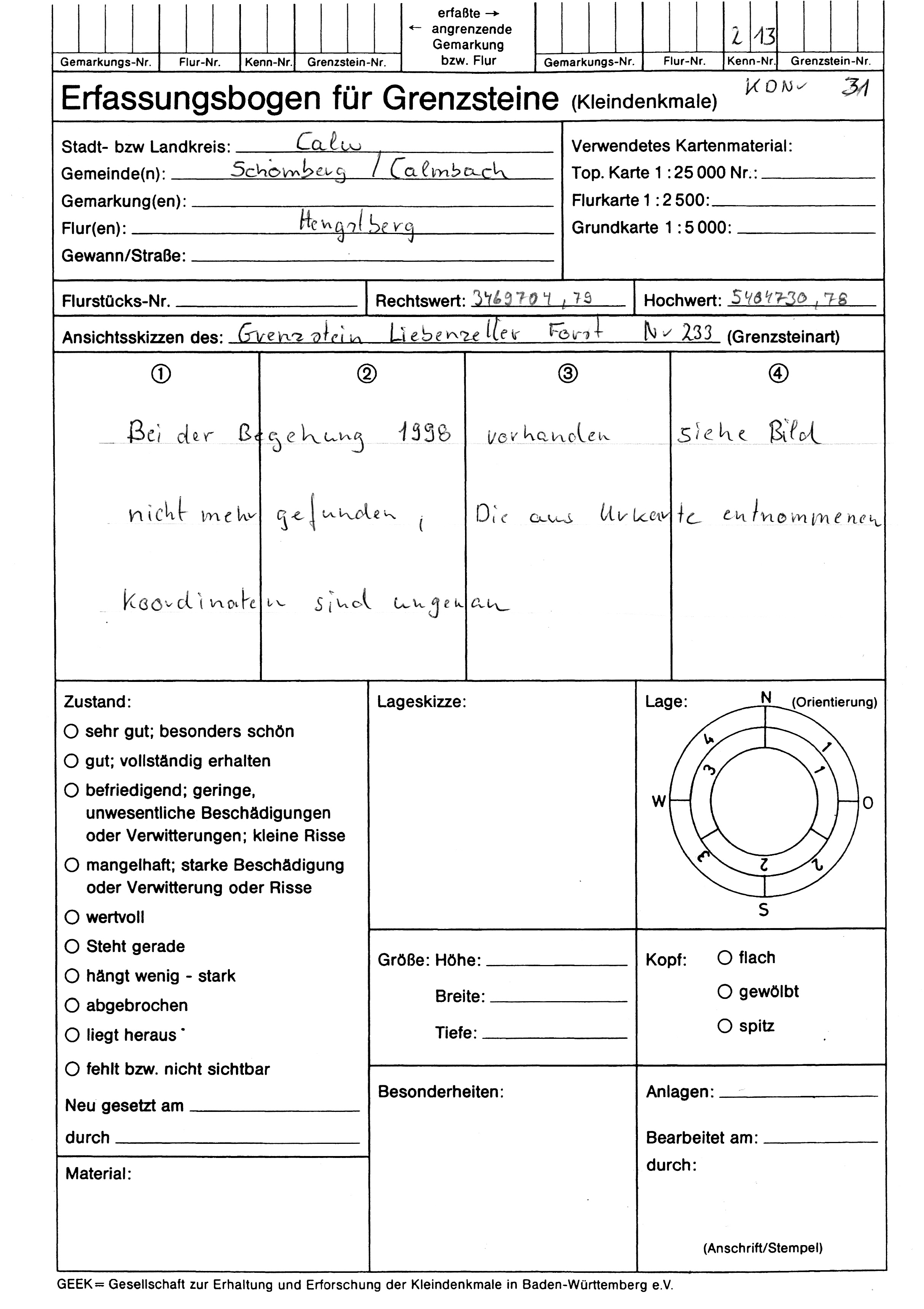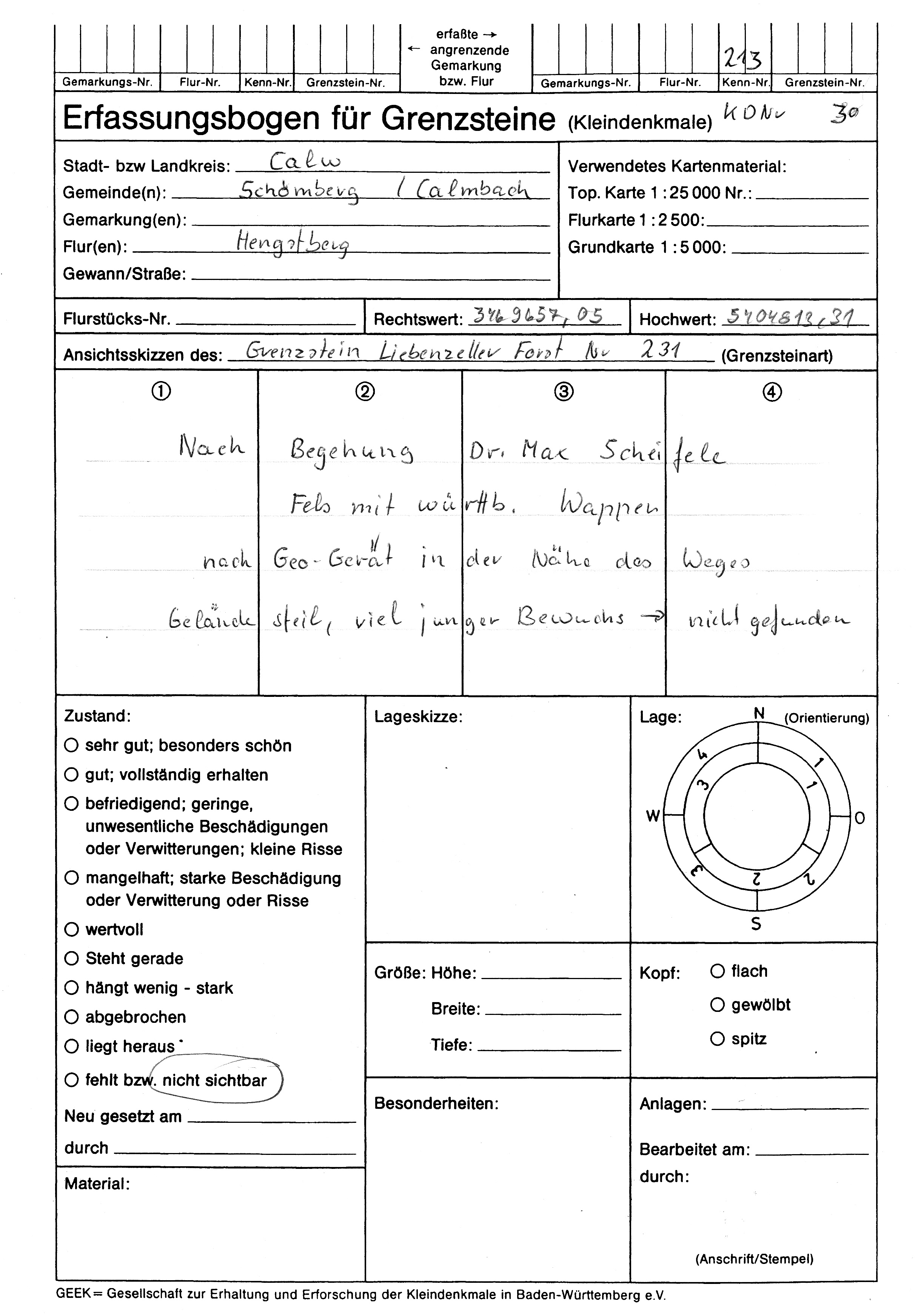 Erfassungsbogen für Grenzsteine mit Bildern, 17 Steine - siehe unten.